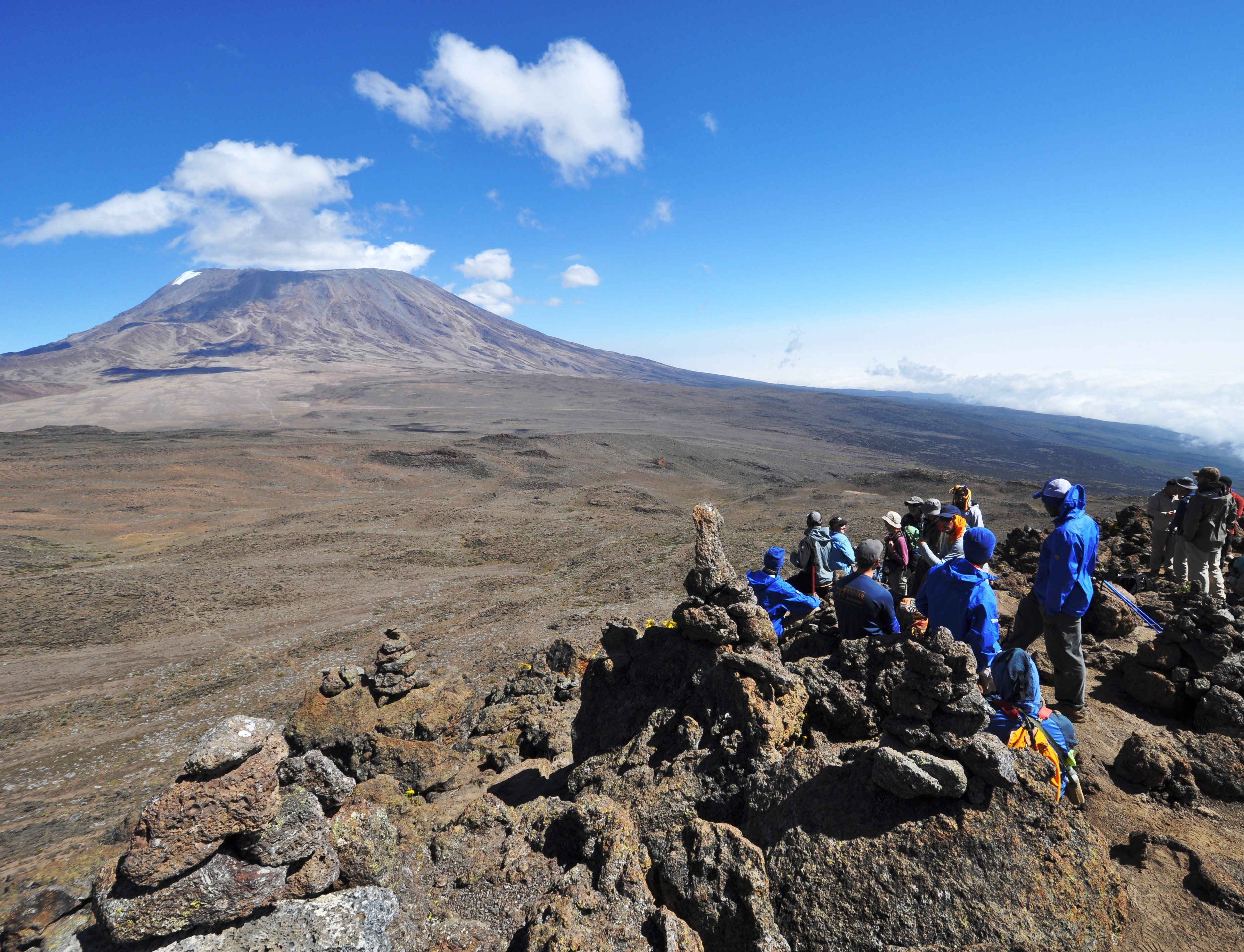 Summit day is a tough, 11 to 16 hour day. This monumental effort is what makes climbing Kilimanjaro an achievement. It begins very early as guides try to time their trekking party to reach Uhuru point at sunrise. Climbers go to sleep after an early dinner the night before and are awaken around midnight to prepare for the summit attempt. After a light snack, climbers ascend in the darkness, cold and wind. It goes without saying that under these conditions, climbing is difficult, especially on loose rock and up a very steep slope. Once you reach the summit, a short time is spent celebrating and taking photos, before returning to high camp, either Barafu or Kibo Hut. There, you eat lunch and regain your strength, before continuing the descent to a much lower camp. The long descent immediately after summiting is where most people get tired, due to the partial night's sleep, the expenditure of energy required to reach the top, and the particularly long distance covered that day. This is completely normal.